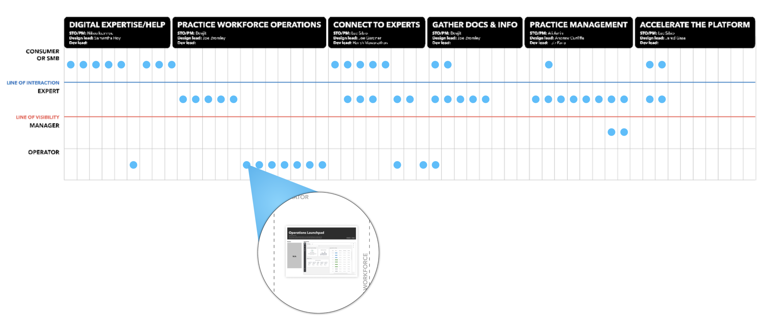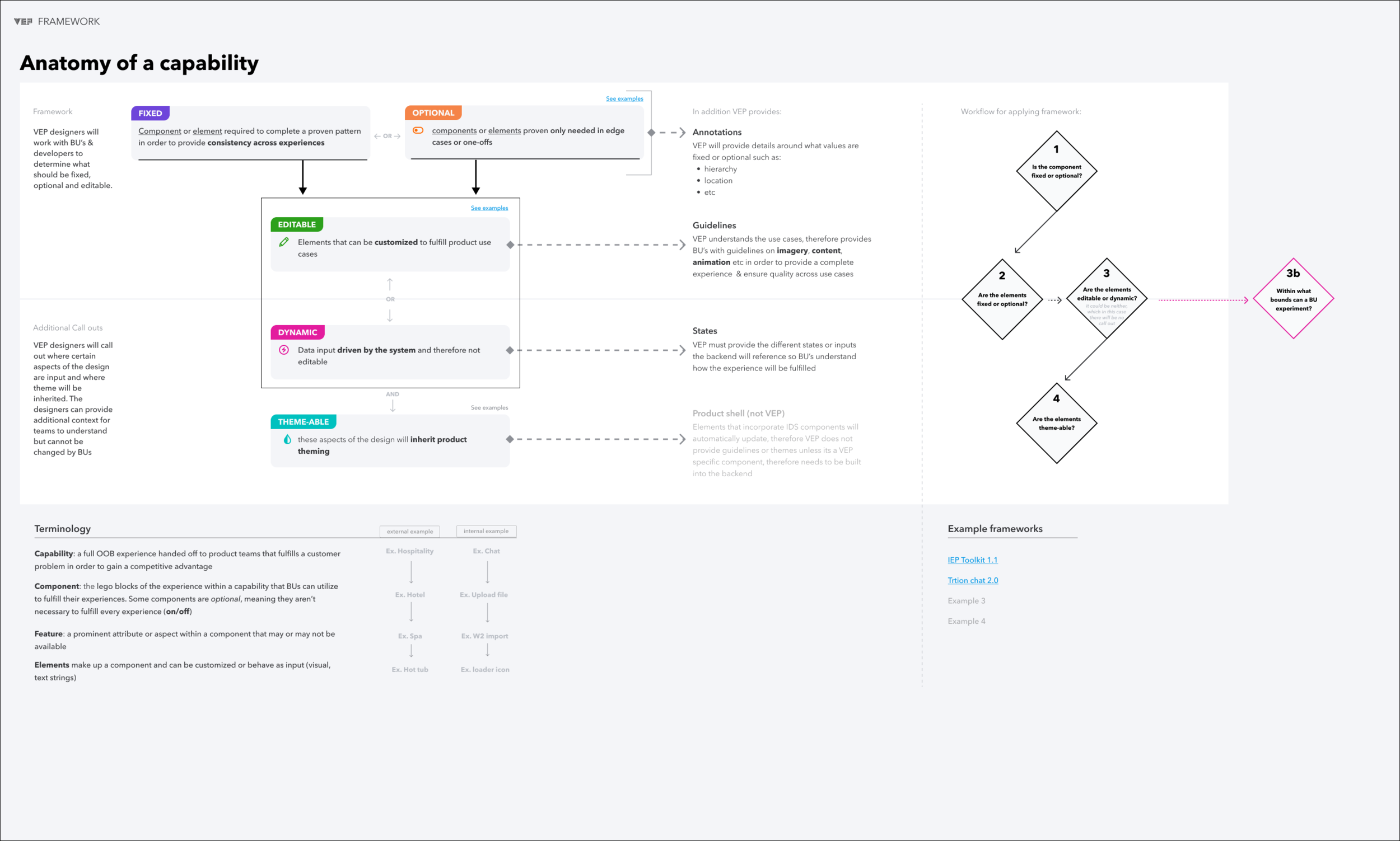 Part of my role as the leader of the platform team is to design frameworks that allow the team to work faster and more efficiently. The following are two examples of frameworks I designed. Anatomy of a capability which outlines the fixed, flexible and free components of each capability. And the Capability City Map which visualizes where each capability fits in the context of the service design platform experience.